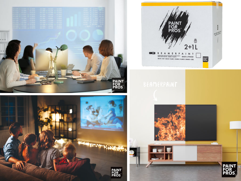 With BeamerPaint you have everything to create a matte, bright white and reflective surface that is ideal for video projection. Whether an office wall needs to be transformed into a presentation screen, or a living room needs to be converted into a home cinema use BeamerPaint for an optimal and sharp projection.