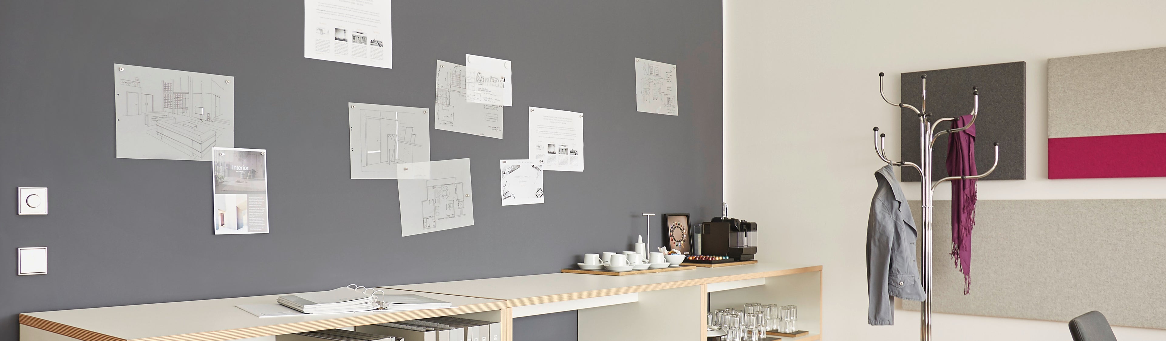 MagnetPlaster can be used indoors on any load-bearing surface on which a ferrous magnetic surface is desired. Presentations, decorations or notes can be fixed to the plaster layer with (neodymium) magnets without having to screw, nail or drill into the surface.